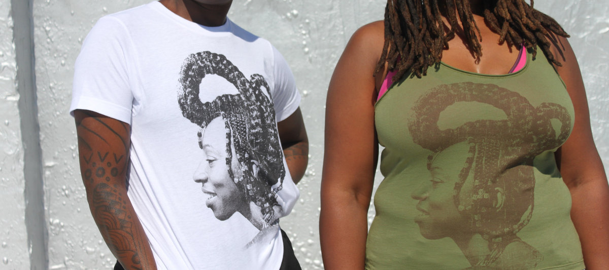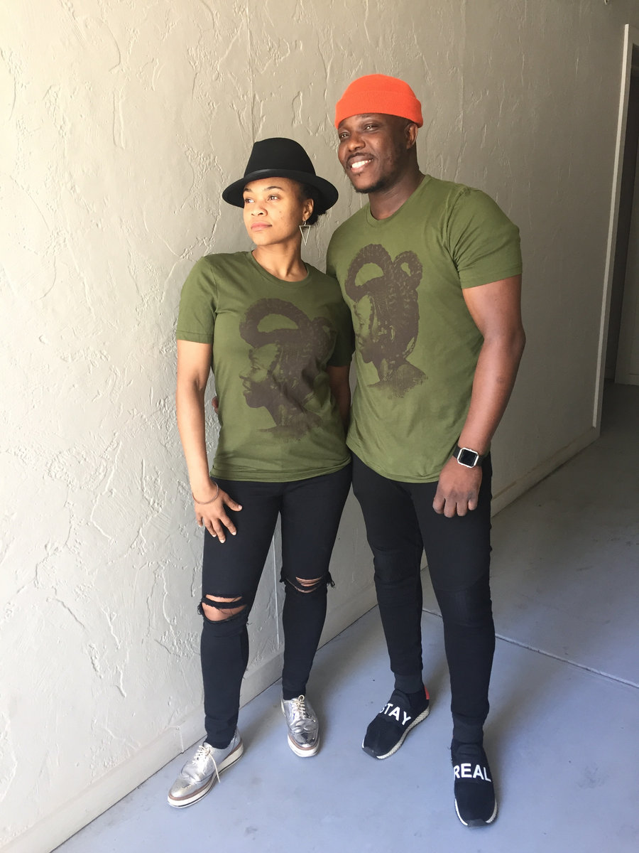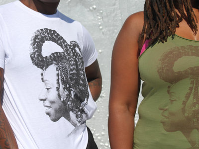 Quazi King profile shot of Wunmi printed in waterbase inks on unisex white 100% cotton crew neck tee. We use Tultex tees, similar in cut to American Apparel. Tank in olive, royal apparel, limited quantities.
